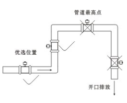 (4)流量計安裝位置介質不滿時,可采取抬高流量計后端管路的方法,使其滿管,嚴禁在管道最高點和出水口安裝流量計。