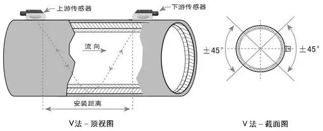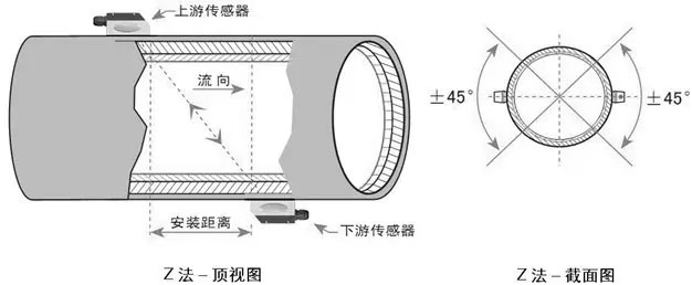 在遇到管道比較大,又比如說液體里面有著懸浮物、管到的內壁結垢很厚或者襯里太厚這些因素,導致了我們使用V法安裝沒有信號,就沒法正常工作,這時候就采取外夾式超聲波流量計的Z安裝方法。Z安裝法的特征就是超聲波在管道中里直接進行傳輸,沒有反射就叫做單聲程,信號損耗就小。Z安裝法可以計量口徑范圍通常是DN100-DN6000。實際安裝時大于200的都應該用該方法來進行安裝。